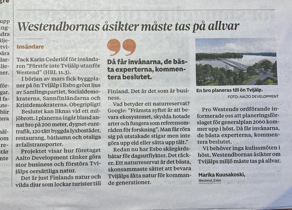 HBL:ssä 25.3.2026 asukkaan kannanotto Tvijälpistä